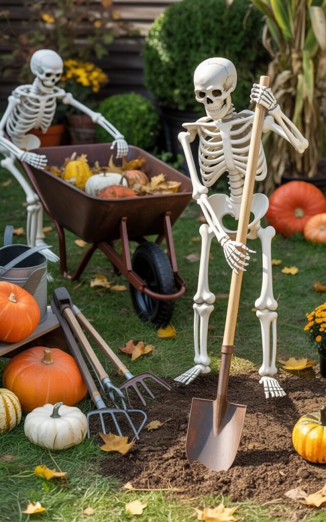 Give your garden a humorous twist by positioning skeleton props as if they’re working hard. One can push a wheelbarrow, another can hold a shovel—it’s both creepy and comical. A few pumpkins and gardening tools complete this unforgettable scene.