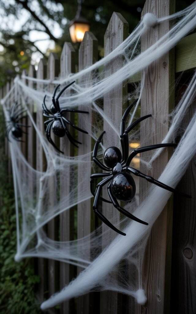 Transform your garden fence into a spooky webbed masterpiece. Stretch white yarn or cotton spider webs across the panels, and stick on giant black spiders for dramatic flair. Under moonlight or a soft garden lamp, the web glistens with an eerie beauty.